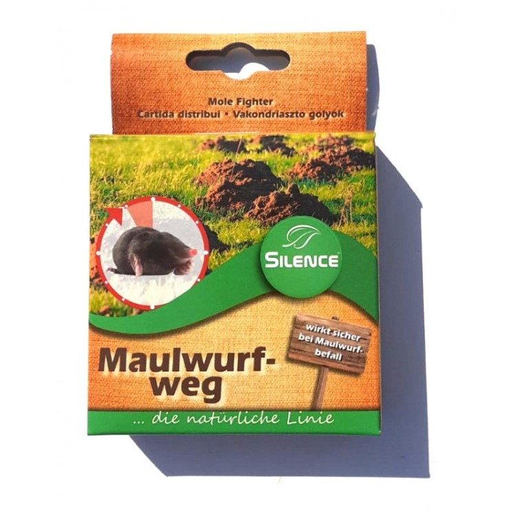 Silence Mole Figher este un produs din Silence Line – linia produselor bio al producatorului german Arthur Schoph Hygiene. Protejeaza gradinile si aleile de musuroaiele de cartita. Este un repelent cu formula speciala tinta lui este simtul olfactiv al cartitelor. Repelentul este creat pentru a emite un miros repulsiv pentru cartite. Acestea parasesc locul pe care l-au infestat si sunt tinute la distanta pentru o buna perioada de timp. MOD DE PREZENTARE : 25 bile/ 50m²