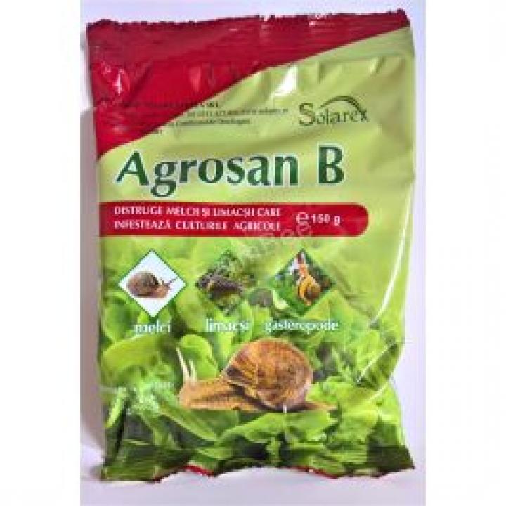 Date tehnice Moluscocid AGROSAN B • Substanta activa: metaldehida 5 % • Formulare: momeli sub forma de granule de culoare albastra • Numar certificat de omologare: 2722 din 25.10.2007 Omologari Moluscocid AGROSAN B Legume Daunatori combatuti: Limacsi si melci, Limaxul cenusiu (Agriolimax agreste) Doza: 15 kg/ha Caracteristici Moluscocid AGROSAN B • Moluscocid sub forma de granule de lungimi diferite, cuprinse intre 5-7 cm, cu diametrul interior de 1 mm, de culoare albastra • Continut de 5% metaldehida • Nu fermenteaza, nu mucegaieste, nu este spalat de ploi, nu este îndepartat de vant • Produs bogat in proteine pentru atragerea melcilor • Rezista la descompunere in timp • Este foarte practic si usor de utilizat Mod de actiune Moluscocid AGROSAN B Agrosan B distruge limacsi, melci si alte gasteropode care infesteaza culturile de legume. Produsul atrage molustele cu ajutorul proteinelor continute in momeala si le distruge cu ajutorul substantei metaldehida. Mod de utilizare Moluscocid AGROSAN B Momeala granule Agrosan B se aplica prin imprastiere, in randuri sau in gramajoare, preferabil seara, dupa o eventuala ploaie sau irigare. Pentru a fi evitate infestarile din exterior, se recomanda ca produsul sa se aplice ca bariera de-a lungul marginilor suprafetelor de tratat. • Testul pentru care a fost avizat: melci fara cochilie (Agriolimax agreste) • Produsul trebuie folosit de unul singur • Tratamentele cu Agrosan B se vor suspenda cu 20 de zile inainte de recoltare • Perioada de aplicare: martie-octombrie
