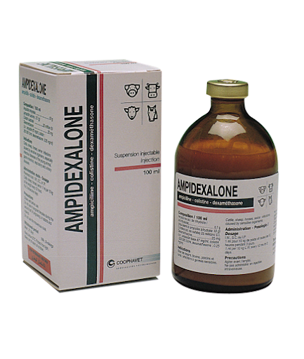 DENUMIREA PRODUSULUIAMPIDEXALONE 100 ML DENUMIREA PRODUSULUI MEDICINAL VETERINAR AMPIDEXALONE, suspensie injectabila pentru bovine, cabaline si suine. DECLARAREA SUBSTANTELOR ACTIVE SI A ALTOR SUBSTANTE Fiecare ml de produs contine: Substante active:Ampicilina (ca trihidrat) 87 mgColistin (sub foma de sulfat)250000 UIDexametazona 0,25 mg. Excipienti:Parahidroxibenzoat de metil (E218)1,25 mg;Parahidroxibenzoat de propil (E216)0,25 mg. FORMA FARMACEUTICA: Suspensie injectabila. DIMENSIUNEA AMBALAJULUI:100 ml. SPECII TINTA:Bovine, cabaline, suine. INDICATIE (INDICATII) Bovine, cabaline, suine:- In tratamentul infectiilor provocate de microorganisme sensibile la ampicilina si colistin (infectii gastrointestinale, infectii ale tractului respirator si urinar).- In tratamentul preventiv in grupuri de animale unde boala a fost diagnosticata. CONTRAINDICATIINu se utilizeaza in caz de hipersensibilitate cunoscuta la antibioticele beta-lactamice. Nu se utilizeaza pentru iepuri si rozatoare.Nu se utilizeaza la animalele care sufera de diabet zaharat. hiperadrenocorticism, insuficienta renala si cardiaca sau ulcer duodenal.Nu se administreaza intravenos. REACTII ADVERSE Penicilinele si cefalosporinele pot provoca reactii de hipersensibilitate (anafilaxie) dupa administrare.Reactiile alergice la aceste substante pot fi ocazional serioase.Utilizarea de corticosteroizi la bovinele in lactatie poate sa induca o scadere temporara a productiei de lapte. POSOLOGIE PENTRU FIECARE SPECIE, CALE (CAI) DE ADMINISTRARE SI MOD DE ADMINISTRARE:Se administreaza la bovine, suine si cabaline pe cale intramusculara, subcutanat si intraperitoneal. 1 ml produs pe 10 kg greutate corporala, la fiecare 12 ore, timp de 3 zile consecutiv.Pentru a se asigura doza corespunzatoare, greutatea corporala a animalelor trebuie calculata cat mai exact, pentru a se evita subdozarea produsului. RECOMANDARI PRIVIND ADMINISTRAREA CORECTA:La injectarea intramusculara, cantitatile administrate intr-un singur punct trebuie sa fie moderate pentru a nu rani sau a se deteriora structurile histologice si anatomice.A se agita flaconul energic inainte de utilizare. TIMP DE ASTEPTARE:Carne si organe: 21 de zile;Lapte: 9 mulsori (4,5 zile). ATENTIONARE (ATENTIONARI) SPECIALA (SPECIALE), DUPA CAZ:Atentionari speciale pentru fiecare specie tinta.La injectarea intramusculara, cantitatile administrate intr-un singur punct trebuie sa fie moderate pentru a nu rani sau a se deteriora structurile histologice si anatomice. Precautii Speciale pentru utilizare la animale:Utilizarea produsului trebuie sa se bazeze pe rezultatul testelor de susceptibilitate a bacteriilor izolate din teren. Daca acest lucru nu este posibil, tratamentul trebuie sa se efectueze pe baza informatiilor epidemiologice locale (regiune, ferma) referitoare la susceptibilitatea bacteriilor tinta.La utilizarea produsului trebuie sa se tina cont de politicile antimicrobiene oficiale si locale. Utilizarea produsului in afara instructiunilor din RCP poate determina cresterea prevalentei rezistentei la substantele active si poate determina scaderea eficacitatii tratamentelor ca urmare a rezistentei incrucisate. Precautii speciale care trebuie luate de persoana care administreaza produsul medicinal veterinar la animale:Persoanele cu hipersensibilitate cunoscuta la substantele active trebuie sa evite contactul cu produsul medicinal veterinar.Se vor lua masuri pentru evitarea auto-injectarii accidentale. In caz de auto-injectare accidentala solicitati imediat sfatul medicului si prezentati medicului prospectul produsului sau eticheta. A se evita contactul direct cu pielea, gura sau ochii. Spalati mainile dupa tratament. Utilizare in perioada de gestatie, lactatie sau in perioada de ouat:Nu se utilizeaza in a doua jumatate a gestatiei. Interactiuni cu alte produse medicinale sau alte forme de interactiune:Efectul bactericid al ampicilinei este neutralizat atunci cand molecule cu efect bacteriostatic sunt utilizate concomitent (macrolide, sulfonamide si tetracicline).Corticosteroizii pot reduce raspunsul imun la vaccinare, nu utilizati concomitent cu vaccinuri. Supradozare (simptome, proceduri de urgenta, antidoturi), dupa caz:Nu este cazul. Incompatibilitati:In lipsa studiilor de compatibilitate, acest produs medicinal veterinar nu se va amesteca cu alte produse medicinale veterinare. CONDITII SPECIALE DE DEPOZITARE:A nu se pastra la temperatura mai mare de 25°C. PRECAUTII SPECIALE PENTRU ELIMINAREA PRODUSELOR NEUTILIZATE SAU A DESEURILOR, DUPA CAZ:Medicamentele nu trebuie aruncate in ape reziduale sau resturi menajere.Solicitati medicului veterinar informatii referitoare la modalitatea de eliminare a medicamentelor care nu mai sunt necesare. Aceste masuri contribuie la protectia mediului. MENTIUNEA "NUMAI PENTRU UZ VETERINAR" SI CONDITII SAU RESTRICTII PRIVIND ELIBERAREA SI UTILIZAREA, dupa caz.Numai pentru uz veterinar. Se elibereaza numai pe baza de reteta veterinara. Prezentare ambalaj:Flacon de sticla galbena de tip II, de 100 ml. cu capac din elastomer de nitril si sigiliu cu sistem flip-off din aluminiu.