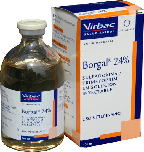 Substante active: Sulfadoxina, Trimetoprim Specii tinta: Bovine, Cabaline, Ovine, Suine Indicatii: Bovine: Infecții respiratorii, gastrointestinale și urogenitale.Suine: Infecții respiratorii, tratamentul meningitei și artritei cauzate de Steptococcus suis. Haemophilus parasuis.Ovine: Infecții respiratorii.Cabaline: Infecții respiratorii și ale tractului genital. Contraindicatii: Nu se utilizează în caz de hipersensibilitate la sulfamide / excipienți. Nu se utilizează în afectiuni hepatice, leziuni ale parenchimului renal, discrazie sangvina. Forma de prezentare: Flacoane a 100 ml soluție injectabilă. Cale administrare: Intramuscular, Intravenos, Subcutanat Timp asteptare: Carne și organe: bovine - 9 zile, ovine - 14 zile, suine - 8 zile, cabaline - 10 zile. Lapte: bovine - 6 mulsori, ovine - 9 mulsori. Doza recomandata: 3 ml / 50 kg greutate corporală administrare unică. Tratamentul poate fi repetat dupa 48 h de la prima administrare.