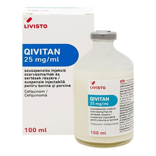 DENUMIREA PRODUSULUIQIVITAN 25 MG/ML 100 ML Suspensie injectabilă pentru bovine şi porcine. DENUMIREA PRODUSULUI MEDICINAL VETERINARQivitan 25 mg/ml suspensie injectabilă pentru bovine şi porcine Cefquinomă. DECLARAREA (SUBSTANŢEI) SUBSTANŢELOR ACTIVE ŞI A ALTOR INGREDIENTE (INGREDIENŢI) 1 ml conţine: Substanţă activă:Cefquinomă 25 mg (echivalent cu 29,64 mg sulfat de cefquinomă).Suspensie de culoare albă până la uşor gălbuie. INDICAŢIE (INDICAŢII)Pentru tratamentul infecţiilor bacteriene la bovine şi porcine, cauzate de microorganisme Gram- pozitive şi Gram-negative sensibile la cefquinomă. Bovine:Boala respiratorie cauzată de Pasteurella multocida şi Mannheimia haemolytica.Dermatită digitală, necroză infecţioasă bulbară şi necrobaciloză interdigitală acută (infecţia piciorului). Mastită acută cauzată de E. coli, cu manifestări sistemice. Viţei:Septicemie cauzată de E. coli la viţei Porcine:Pentru tratamentul infecţiilor bacteriene ale plamanilor şi tractului respirator cauzate de Pasteurella multocida, Haemophilus parastas, Actinobacillus pleuropneumoniae, Streptococcus suis şi de alte microorganisme sensibile la cefquinomă.Sindromul mastită-metrită-agalaxie (MMA) cu implicarea E. coli, Staphylococcus spp., Streptococcus spp. şi a altor microorganisme sensibile la cefquinomă. Purcei:Scăderea mortalităţii în cazuri de meningită cauzată de Streptococcus suis. Pentru tratamentul:Artritei cauzate de Streptococcus spp., E. coli şi alte microorganisme sensibile la cefquinomă.Epidermitei (leziuni uşoare sau medii) cauzate de Staphylococcus hyicus. CONTRAINDICAŢIIA nu se utiliza în caz de hipersensibilitate la antibiotice 6-lactamice sau la oricare dintre excipienţi.A nu se administra la animale cu greutatea corporală sub 1,25 kg.A nu se utiliza la păsări (incluzând ouă) din cauza riscului de răspândire a rezistenţei antimicrobiene la om. REACŢII ADVERSEUtilizarea acestui produs medicinal veterinar poate cauza o reacţie tisulară localizată.Leziunile tisulare se remit la 15 zile de la ultima administrare a produsului medicinal veterinar.In cazuri rare apar reacţii de hipersensibilitate la cefalosporine.Dacă observaţi reacţii grave sau alte efecte care nu sunt menţionate în acest prospect, vă rugăm informaţi medicul veterinar. SPECII ŢINTĂBovine şi porcine. POSOLOGIE PENTRU FIECARE SPECIE, CALE (CĂI) DE ADMINISTRARE ŞI MOD DE ADMINISTRARE Specie Indicaţie Doze Frecvenţă Bovine Boală respiratorie cauzată de Pasteurella multocida şi M. haemolytica Dermatită digitală, necroză infecţioasă bulbară şi necrobaciloză interdigitală acută (infecţia piciorului) 1 mg cefquinomă/kg greutate corporala (2 ml/50 kg greutate corporala) 0 dată pe zi timp de 3 sau 5 zile consecutiv Mastită acută cauzată de E. coli, cu manifestări sistemice 1 mg cefquinomă/kg greutate corporala (2 ml/50 kg greutate corporala) 0 dată pe zi timp de 2 zile consecutiv Viţei Septicemie cu E. coli 2 mg cefquinomă/kg greutate corporala (4 ml/50 kg greutate corporala) 2 mg cefquinomă/kg greutate corporala (4 ml/50 kg greutate corporala) Porcine Boală respiratorie 2 mg cefquinomă/kg greutate corporala (2 ml/25 kg greutate corporala) 0 dată pe zi timp de 3 zile consecutiv. MMA 2 mg cefquinomă/kg greutate corporala (2 ml/25 kg greutate corporala) 0 dată pe zi timp de 2 zile consecutiv. Purcei Meningita Artrita Epidermita 2 mg cefquinomă/kg greutate corporala (2 ml/25 kg greutate corporala) 0 dată pe zi timp de 5 zile consecutiv. Toate tratamentele se administrează prin injecţie intramusculară. Studiile au indicat recomandarea administrării celei de-a doua injecţii şi a celor următoare în locuri de injectare diferite. Locul de injectare preferat este ţesutul muscular de la nivelul părţii mijlocii a gâtului.Pentru a se asigura o dozare corectă, greutatea corporală trebuie determinată cât mai precis posibil, pentru a se evita subdozarea.Agitaţi bine flaconul înainte de utilizare !. RECOMANDĂRI PRIVIND ADMINISTRAREA CORECTĂProdusul medicinal veterinar nu conţine conservanţi antimicrobieni. Ştergeţi septul înaintea extragerii fiecărei doze. Utilizaţi un ac şi o seringă uscate, sterile. Pentru a asigura administrarea precisă a volumului necesar al dozei, trebuie utilizată o seringă gradată adecvată. Acest lucru este deosebit de important când se injectează volume mici, de exemplu, pentru tratamentul purceilor.Când se tratează grupuri de animale, utilizaţi un ac de aspiraţie.Dopul din cauciuc al flaconului poate fi perforat în siguranţă de până la 50 de ori. TIMP DE AŞTEPTAREBovine:Came şi organe: 5 zile.Lapte: 24 ore. Porcine:Carne şi organe: 3 zile. PRECAUŢII SPECIALE PENTRU DEPOZITAREA nu se lăsa la vederea şi îndemâna copiilor.A se proteja de lumină. Perioada de valabilitate după prima deschidere a ambalajului primar: 28 de zile.A nu se utiliza acest produs veterinar după data expirării marcată pe etichetă. Data expirării se referă la ultima zi din luna respectivă.Atunci când un flacon este perforat (deschis) prima dată, trebuie să stabiliţi data la care orice produs rămas în flacon trebuie eliminat, ţinând cont de perioada de valabilitate din momentul deschiderii care este specificată în acest prospect. Data eliminării trebuie să fie specificată în spaţiul special dedicat de pe etichetă.