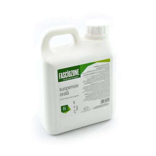 SPECII ŢINTĂ: Bovine, Ovine, Caprine. INDICAŢII: Este recomandat pentru tratamentul fasciolozei (Fasciola spp.), paramfistomozei (Paramphistomum spp.) şi cestodozelor (pentru eliminarea proglotelor) la bovine, ovine şi caprine. COMPOZIŢIE: 1 ml suspensie orală conţine: Oxiclozanid…………………….....................…..……….....50 mg Excipienţi: Acid benzoic…………………………….…...........................2 mg Dioxid de siliciu coloidal, xantan gum, polisorbat 80, apă ultrapurificată. CONTRAINDICAŢII: Nu se va administra animalelor cu hipersensibilitate cunoscută la substanţa activă sau la oricare dintre excipienţi. REACŢII ADVERSE: După tratamentul poate sa apară o uşoară anorexie şi diaree. Dozele mari pot cauza orbire, hipertermie, convulsii şi moarte, acestea fiind semnele clasice ale inhibării reacţiilor de fosforilare de la nivel celular. Reacţiile adverse apar de obicei la animalele foarte stresate, la cele cu probleme severe de nutriţie sau de metabolism sau la animalele cu infestaţii parazitare puternice. Dacă observaţi reacţii grave sau alte efecte care nu sunt menţionate în acest prospect, vă rugăm să informaţi medicul veterinar. POSOLOGIE PENTRU FIECARE SPECIE, CĂI DE ADMINISTRARE ŞI MOD DE ADMINISTRARE: Se administrează pe cale orală în următoarele doze: Se va agita bine flaconul înainte de utilizare. Dozele recomandate sunt: • La bovine: - 10 ml produs/50 kg greutate corporală (10 mg oxiclozanid/kg greutate corporală). Se va evita depăşirea dozei de 80 ml produs pentru un animal. • La ovine şi caprine: - 3 ml produs/10 kg greutate corporală (15 mg oxiclozanid/kg greutate corporală). Se va evita depăşirea dozei de 15 ml produs pentru un animal. Pentru asigurarea unei doze corecte greutatea corporală trebuie să fie determinată cât mai exact posibil, pentru evitarea supradozării și a subdozării. RECOMANDĂRI PRIVIND ADMINISTRAREA CORECTĂ: A se agita flaconul înainte de utilizare. TIMP DE AŞTEPTARE: Bovine, ovine, caprine: carne şi organe – 14 zile lapte – zero zile + PRECAUŢII ŞI ATENŢIONĂRI SPECIALE PRECAUŢII SPECIALE PENTRU DEPOZITARE: A se păstra în ambalajul original, bine închis, în locuri uscate, la temperaturi sub 25OC, ferit de îngheț și de acțiunea directă a luminii. A nu se lăsa la vederea și îndemâna copiilor. A nu se utiliza după data expirării marcată pe flacon. Perioada de valabilitate după prima deschidere a ambalajului primar: 3 luni. Perioada de valabilitate a produsului medicinal veterinar aşa cum este ambalat pentru vanzare: 2 ani. ATENŢIONĂRI SPECIALE: Înainte de alegerea dozei de tratament se va acorda o atenţie deosebită estimării greutăţii animalelor care se tratează. Se va acorda o atenţie deosebită animalelor mari, gestante şi animalelor aflate sub stres din cauza condiţiilor meteorologice nefavorabile, a subnutriţiei, a staţionării în ţarc, etc. FASCIOZONE are acţiune semnificativă asupra formelor mature de paraziţi. Pentru evitarea dezvoltării rezistenţei paraziţilor la tratamentul cu antihelmintice se vor evita: - utilizarea frecventă şi repetată a antihelminticelor din aceeaşi clasă pentru o perioadă lungă de timp; - subdozarea, prin subestimarea greutăţii corporale sau în urma administrării greşite a medicamentului. Cazurile clinice suspectate de rezistența la antihlmintice trebuie investigate utilizând teste corespunzătoare (de ex. Testul de reducere a nr de ouă din fecale). În cazul dezvoltării rezistenţei paraziţilor la anumite antihelmintice utilizaţi pentru tratament un antihelmintic din altă clasă farmacologică şi cu un mod de acţiune diferit. Precauţii speciale pentru utilizarea la animale: Pentru evitarea intoxicaţiilor nu se vor depăşi dozele indicate. După tratament animalele trebuie să fie mutate pe o păşune fără gazde intermediare pentru a se evita reinfectarea. Precauţii speciale care trebuie luate de persoana care administrează produsul medicinal veterinar la animale: Persoanele cu hipersensibilitate cunoscută la oxiclozanid trebuie să evite contactul cu produsul medicinal veterinar. A nu se mânca, bea sau fuma în timpul utilizării produsului. A se evita contactul cu ochii. Evitați contactul cu pielea. A se spăla mâinile imediat după utilizare. Se vor îndepărta imediat eventualele urme de produs ajunse în mod accidental în ochi sau pe piele, prin spălare cu multă apă. În caz de contact accidental cu produsul solicitaţi imediat sfatul medicului şi prezentaţi medicului prospectul produsului sau eticheta. Utilizare în perioada de gestație, lactație: Nu există interdicții de utilizare Interacțiuni cu alte produse medicinale sau alte forme de interacțiune: Nu se cunosc. Supradozare (simptome, proceduri de urgenţă, antidoturi), după caz: Se vor respecta dozele recomandate. În cazul supradozării se observă semnele clinice clasice ale inhibării reacţiilor de fosforilare (sinteza ATP), cum sunt: orbirea, hipertermia, convulsiile şi moartea. În caz de supradozare consultaţi medicul veterinar. Incompatibilităţi majore: În absența studiilor de compatibilitate, acest produs medicinal veterinar nu trebuie amestecat cu alte produse medicinale veterinare. PRECAUŢII SPECIALE PENTRU ELIMINAREA PRODUSULUI NEUTILIZAT SAU A DEŞEURILOR, DUPĂ CAZ: Medicamentele nu trebuie aruncate în ape reziduale sau împreună cu resturi menajere. Solicitaţi medicului veterinar informaţii referitoare la modalitatea de eliminare a medicamentelor care nu mai sunt necesare. Aceste măsuri contribuie la protecţia mediului. + MOD DE PREZENTARE -Flacoane din PVC x 50 ml închise cu capac din polietilenă de înaltă densitate. -Flacoane din HDPE x 100 ml, 200 ml, 500 ml şi 1000 ml închise cu capac din polietilenă de înaltă densitate. -Canistre din HDPE x 1L şi 5L închise cu capac din polipropilenă. Nu toate dimensiunile de ambalaj pot fi
