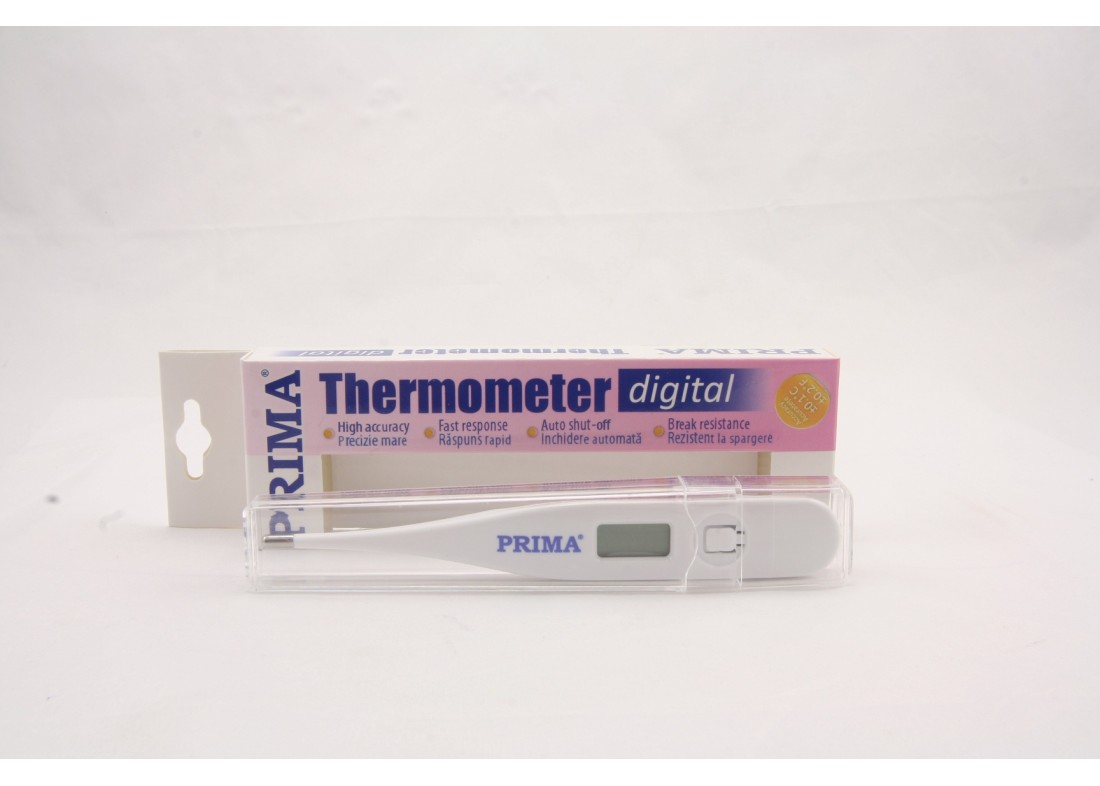 Termometru Digital cu varf standard Prima, in cutie plastic: dispozitiv medical de masurare a temperaturii, cu varf standard, usor de utilizat si de dezinfectat, rezistent la spargere, cu inchidere automata. Este prevazut cu ecran cu cristale lichide si buton pentru deschidere si inchidere facila. Pastreaza in memorie inregistrarea ultimei valori masurate. Efectueaza masurarea precisa a temperaturii in maxim 10 secunde, intre limitele 32°C - 42.9°C. Durata bateriei este de aproximativ 200 ore.